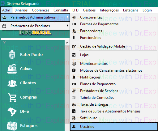 A aba Perfis*, localizada na tela de Usuários* do módulo Administrativo* do Sistema Retaguarda foi desenvolvida para que um usuário administrador possa realizar as configurações das permissões de utilização do sistema para outros usuários, podendo alterar suas atribuições e definições. O Sistema Retaguarda utilizará essas informações para limitar o uso dos módulos do sistema de forma adequada para cada usuário, definindo seus respectivos módulos de acessos, funções e operações. *Ver nas imagens, Usuários - Perfis e Caminho - Usuários.