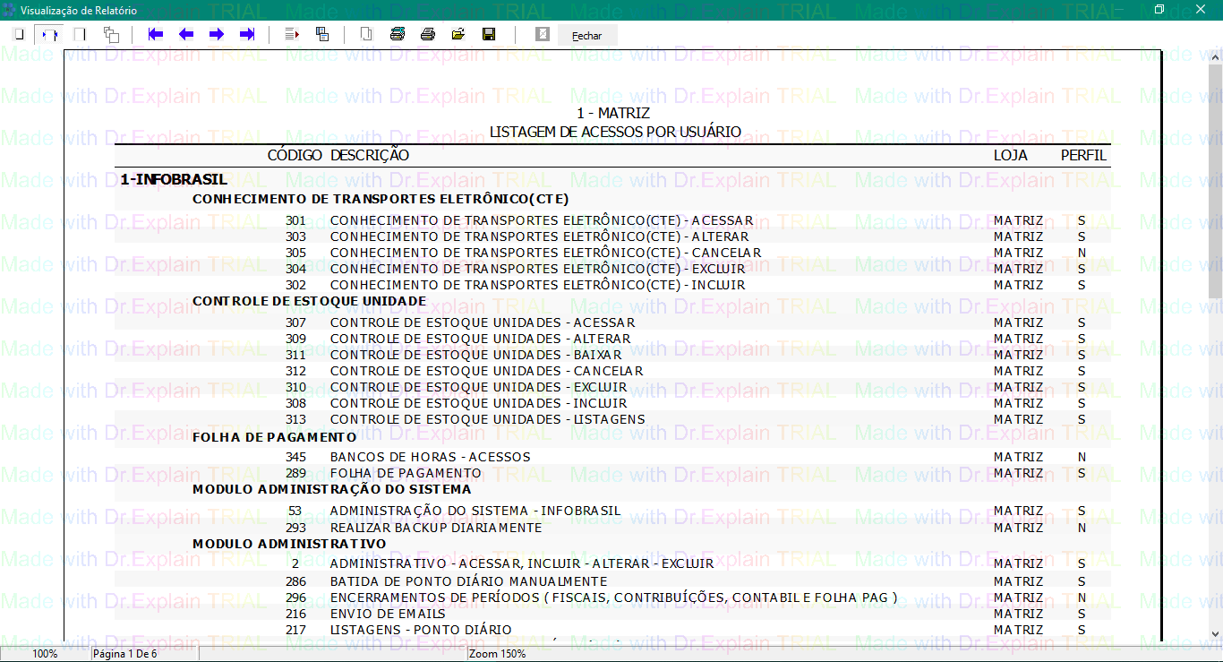 ACIMA - Relatório da Listagem de Acessos por usuários.Imprimir*Ver nas imagens, Usuários - Perfis, destaque Verde e Relatório - Listagem de Acessos.O botão Imprimir contém a função Relatório. Com ela o usuário poderá gerar uma listagem de acessos com os perfis de usuários, podendo filtrar por loja, usuário e módulo do sistema. Podendo também filtrar os perfis ativos e inativos, além de ordenação alfabética e numérica. Ainda é possível imprimir o arquivo exibido para papel A4 ou salvar o mesmo em arquivo formato PDF, na própria máquina local.